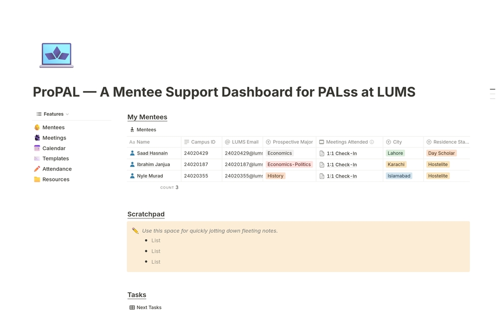 Introducing ProPAL, a template designed for Peer Ambassadors at LUMS (PALs) to make mentoring tasks easier, it helps you manage mentee data, track interactions, and stay organized as a PAL throughout the academic year reducing effort on your part in remembering key details and interactions about all your mentees.
