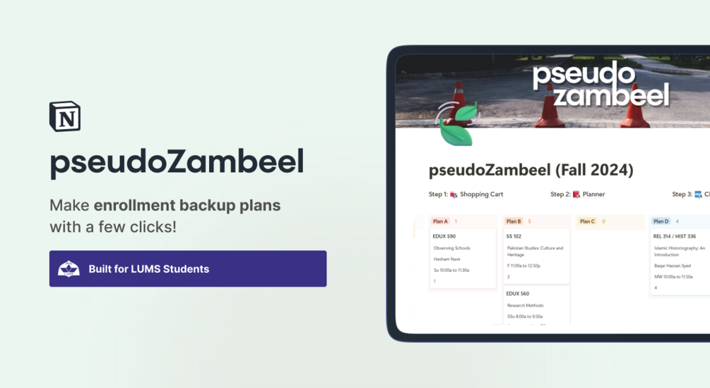 Introducing pseudo-Zambeel: A Course Planner for LUMS Students! It allows you to search for current courses being offered at LUMS this semester and make backup plans with just a few clicks!