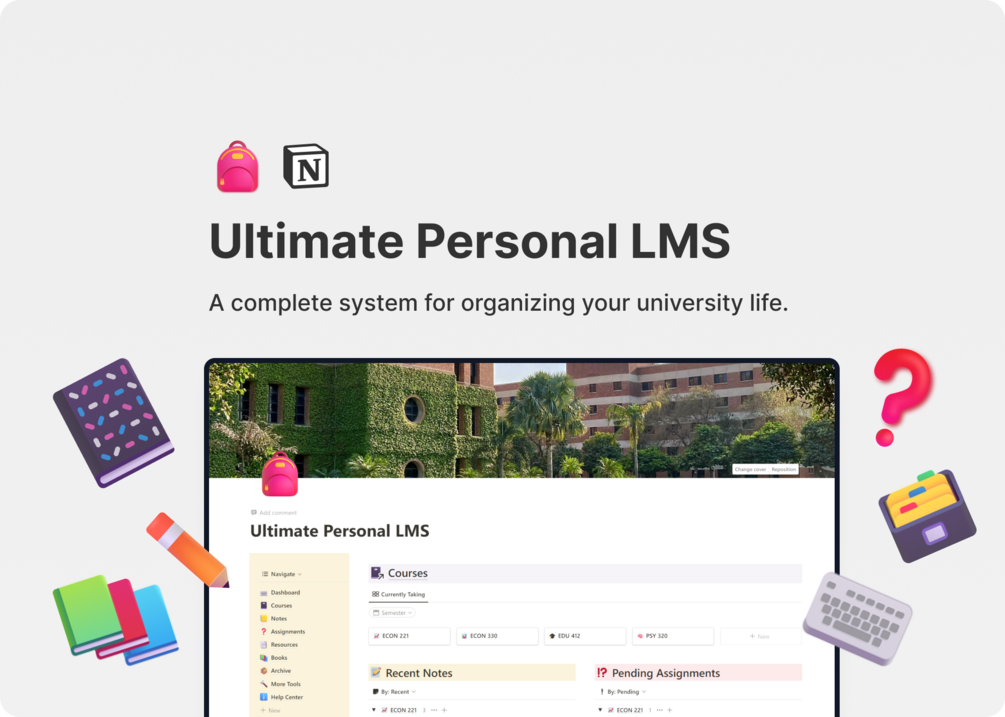 Introducing: The Ultimate Personal LMS, a complete system for organizing your university life. The template is built from scratch using the best Notion practices and by incorporating powerful frameworks for personal knowledge management into an easy-to-use structure.